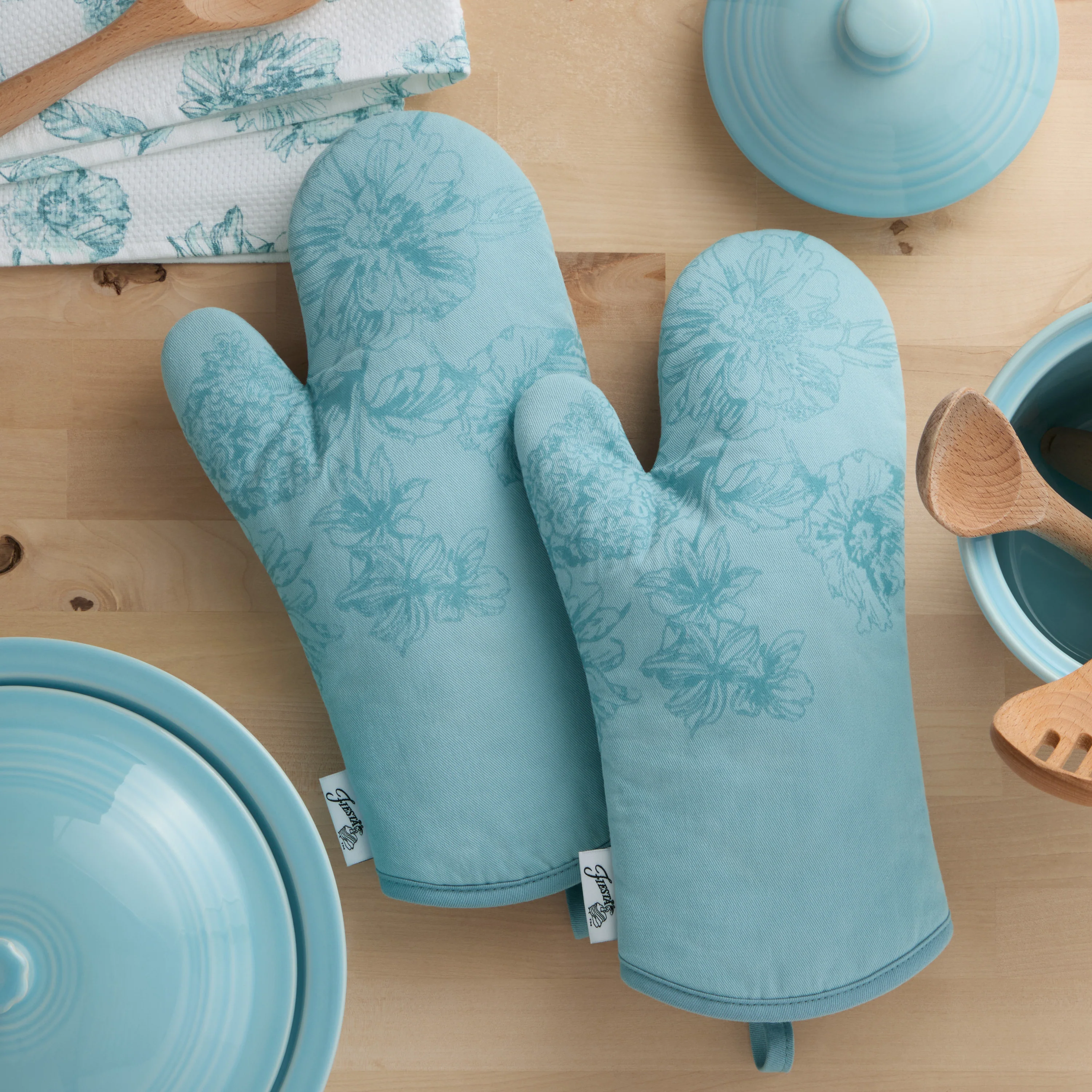 Get inspired to decorate and create in the kitchen with the Fiesta Botanical Floral Kitchen Collection. Whether you’re looking for inspiring décor or every day functional kitchen essentials this stylish collection will bring color and comfort to your home. This mini oven mitt set includes two decoratively printed mini oven mitts. These heat resistant oven mitts are durable, flexible, and protect your hands while cooking or baking your favorite recipes. Use while celebrating seasonal holidays or for everyday use in your kitchen. Made of machine washable Cotton, these oven mitts are easy to clean, dry and store with decorative hang loop.